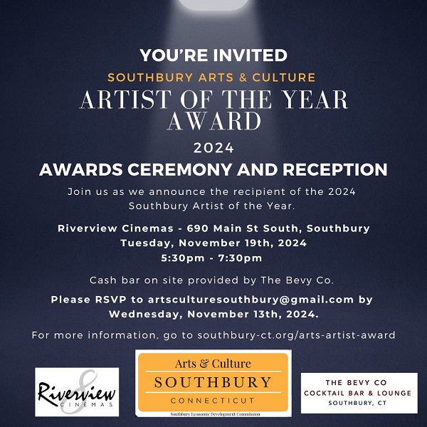 The Arts & Culture Subcommittee of the Southbury Economic Development Commission is proud to announce the recipient of the 2024 Southbury Artist of the Year Award at an exclusive event sponsored by Riverview Cinemas & Playhouse. This prestigious award recognizes the outstanding contributions of Southbury's local artists and their influence on the town’s vibrant cultural scene.